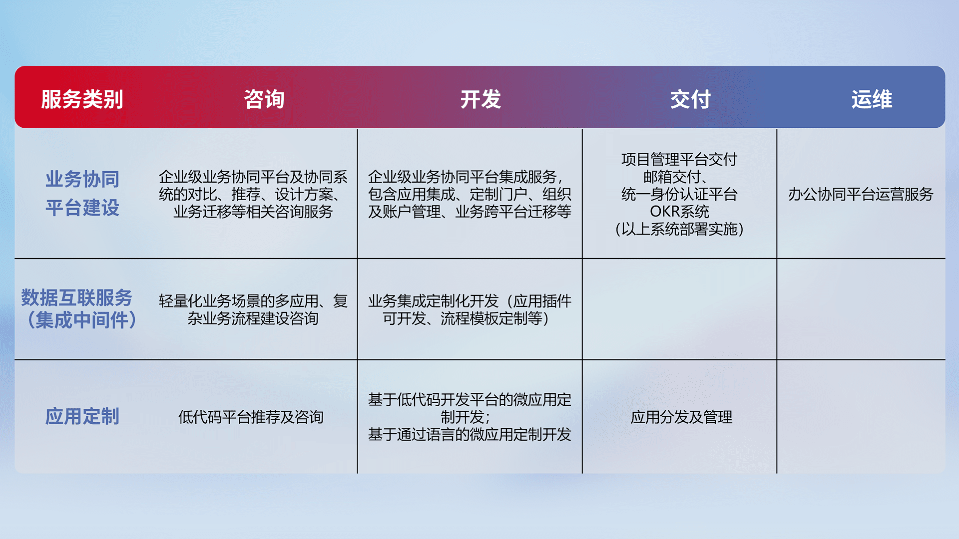 针对钉钉、、企微、、IDaas等平台级产品提供产品的规划、、方案、、、交付、、、定制化开发等服务,,实现如统一协同办公、、智能客户服务、、混合会议管理、、智能数据查询、、等业务场景,,,实现数字化转型。。。。
