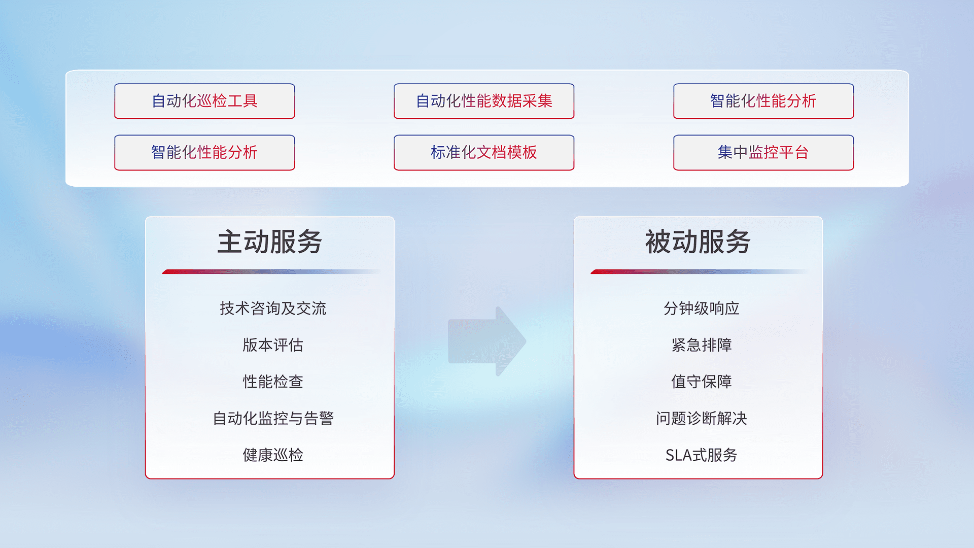 智能化工具和标准化文档,,保障服务质量,,提供主动服务(包含技术咨询、、版本评估、、、性能检查、、、自动化监控与告警、、健康巡检)和被动服务包含(分钟级响应、、紧急排障、、、值守保障、、问题诊断解决、、SLA服务)。。。
